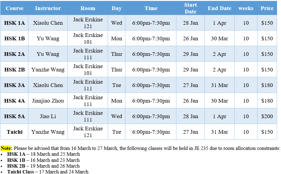 - Returning students are advised to consult their previous instructor or Dr. Yu Wang (contact details at the bottom of the page) to determine the most suitable course level.